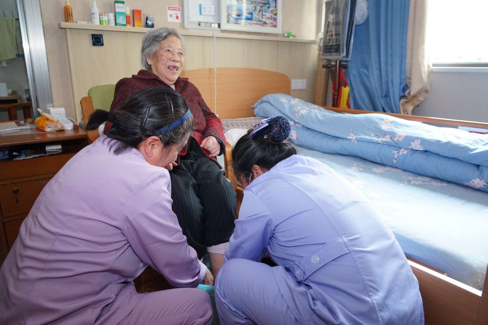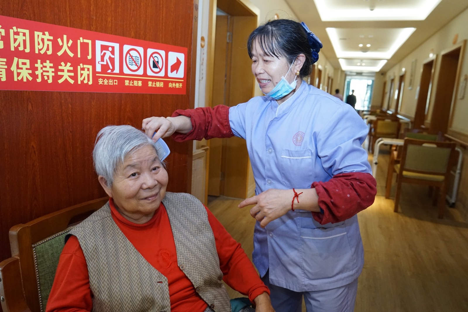 護(hù)理人員做好自身防疫的同時(shí)也為老人們送上更多的關(guān)心與溫暖,特別是走路不方便的老人,喂食、理發(fā)、剪指甲、洗腳、打掃室內(nèi)衛(wèi)生、紓解老人對(duì)疫情恐慌心理,這些原本習(xí)以為常的舉動(dòng)在特殊時(shí)期總能讓人感覺倍加溫馨。